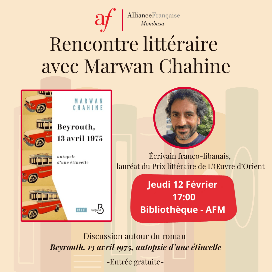 Meeting and discussion with Marwan Chahine, a Franco-Lebanese writer winner of L’Œuvre d’Orient Literary Prize. A unique opportunity to discover his book “Beyrouth, 13 avril 1975, autopsie d’une étincelle” in French.
